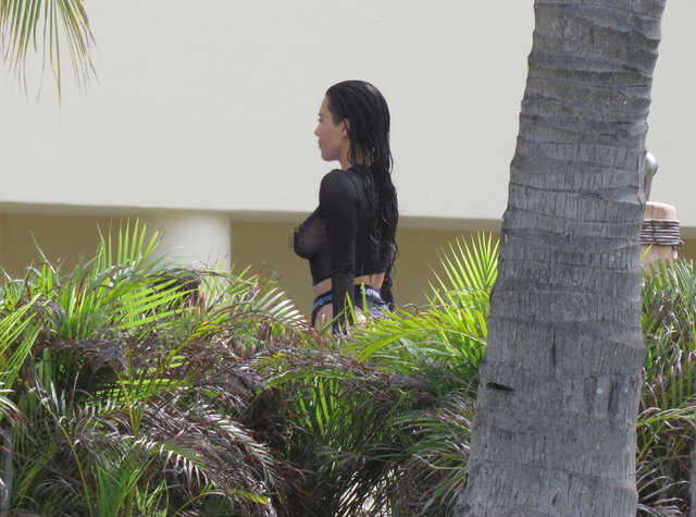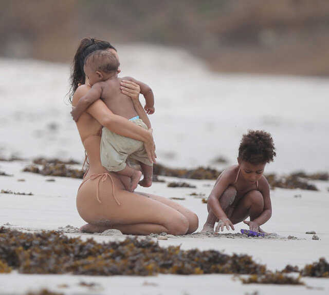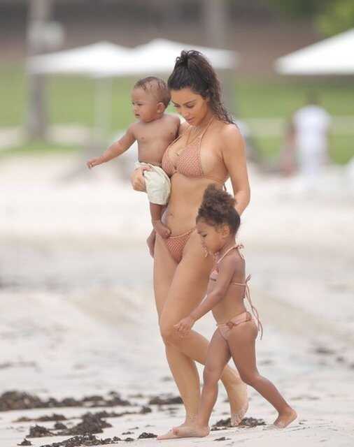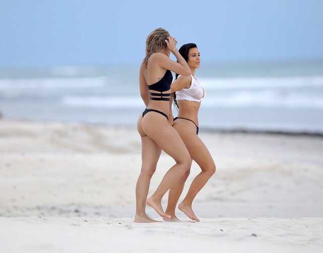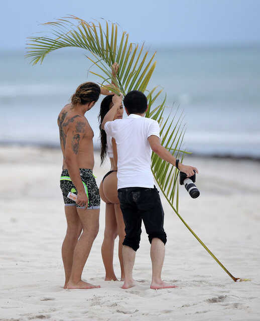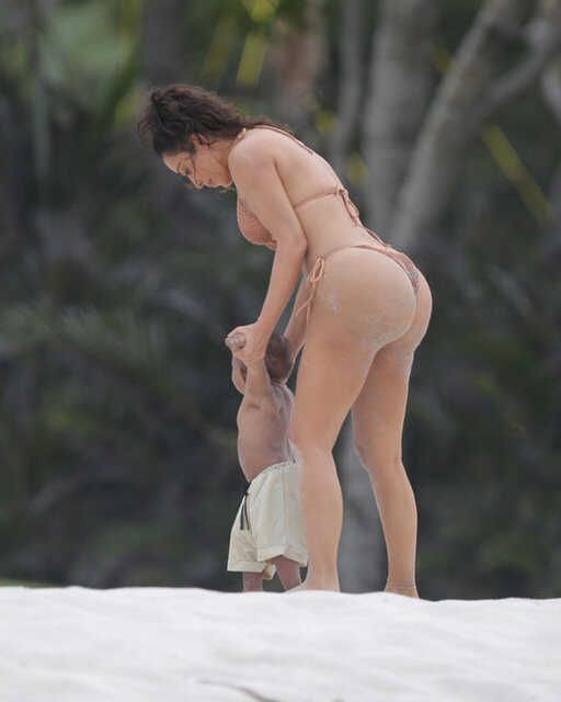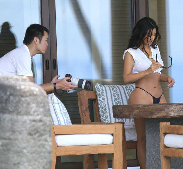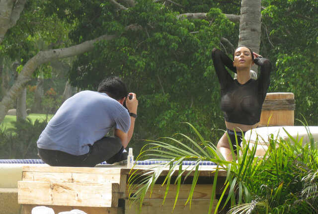 Kim Kardashian fotoğraf çekimindeKim daha sonra üzerini değiştirdi ve çekimlere plajda devam etti.